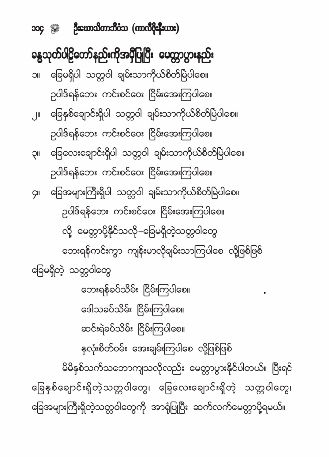 ၅။ တရားအလုပ်မ၀င်ခင် ကြိုတင်ပြင် – ဆရာတော် ဦးဃောသိတာဘိဝံသ (စာအုပ်)တရားစခန်းအတွင်း ရွတ်ဖတ်မည့် ဘုရားရှိခိုး မေတ္တာပို့ စာအုပ်များ