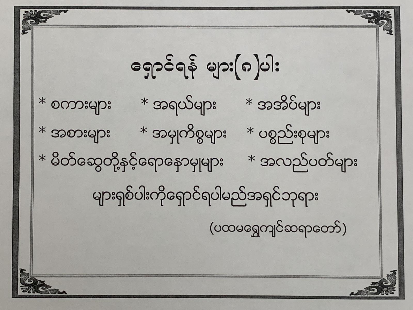 ပဋိသမ္ဘိဒါ(၄)ပါး, တော(၁၁)ပါးဖြင့်ရှုခြင်း, အတ္တစွဲ(၄)မျိုး, လက္ခဏာရေး(၃)ပါး, ဃန(၄)မျိုး,သမ္ဖသနညဏ် – handwrittenDownloadဓမ္မပူဇာ ဆုတောင်း အမျှဝေ
