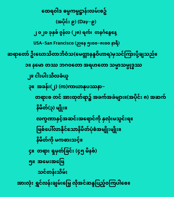 ထေရဝါဒ ဓမ္မကမ္မဌာန်း လမ်းစဥ် အပိုင်း(၉) June 28, 2020 / ညနေ သဘောတရားရေးရာအပိုင်း, ထေရဝါဒ ဓမ္မကမ္မဌာန်း လမ်းစဥ် အပိုင်း(၉) Day 9 နမော တဿ ဘဂဝတော အရဟတော သမ္မာသမ္ဗုဒ္ဓဿ (သုံးကြိမ်) သင်တန်း တရား ရှုမှတ်ခြင်း နှင့် တရားသိမ်းသင်တန်းမှတ်စုများ Downloads https://www.facebook.com/maungkyi.shein/videos/2639714429599877