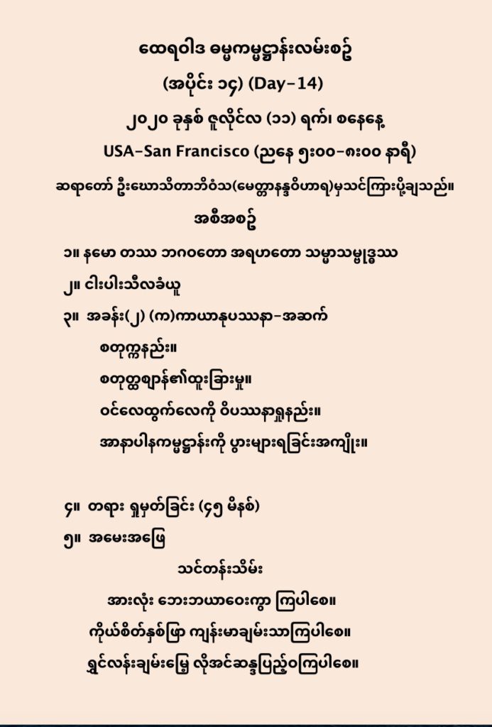 ထေရဝါဒ ဓမ္မကမ္မဌာန်း လမ်းစဥ် အပိုင်း(၁၄) July 11, 2020 / ညနေ သဘောတရားရေးရာအပိုင်း, ထေရဝါဒ ဓမ္မကမ္မဌာန်း လမ်းစဥ် အပိုင်း(၁၄) Day 14 နမော တဿ ဘဂဝတော အရဟတော သမ္မာသမ္ဗုဒ္ဓဿ (သုံးကြိမ်) သင်တန်း တရား ရှုမှတ်ခြင်း နှင့် တရားသိမ်းသင်တန်းမှတ်စုများ Downloads https://www.facebook.com/maungkyi.shein/videos/2650442481860405