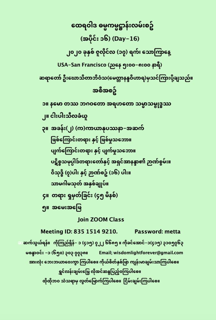 ထေရဝါဒ ဓမ္မကမ္မဌာန်း လမ်းစဥ် အပိုင်း(၁၆) July 17, 2020 / ညနေ သဘောတရားရေးရာအပိုင်း, ထေရဝါဒ ဓမ္မကမ္မဌာန်း လမ်းစဥ် အပိုင်း(၁၆) Day 16 နမော တဿ ဘဂဝတော အရဟတော သမ္မာသမ္ဗုဒ္ဓဿ (သုံးကြိမ်) သင်တန်း တရား ရှုမှတ်ခြင်း နှင့် တရားသိမ်းသင်တန်းမှတ်စုများ Downloads https://www.facebook.com/maungkyi.shein/videos/2655444824693504