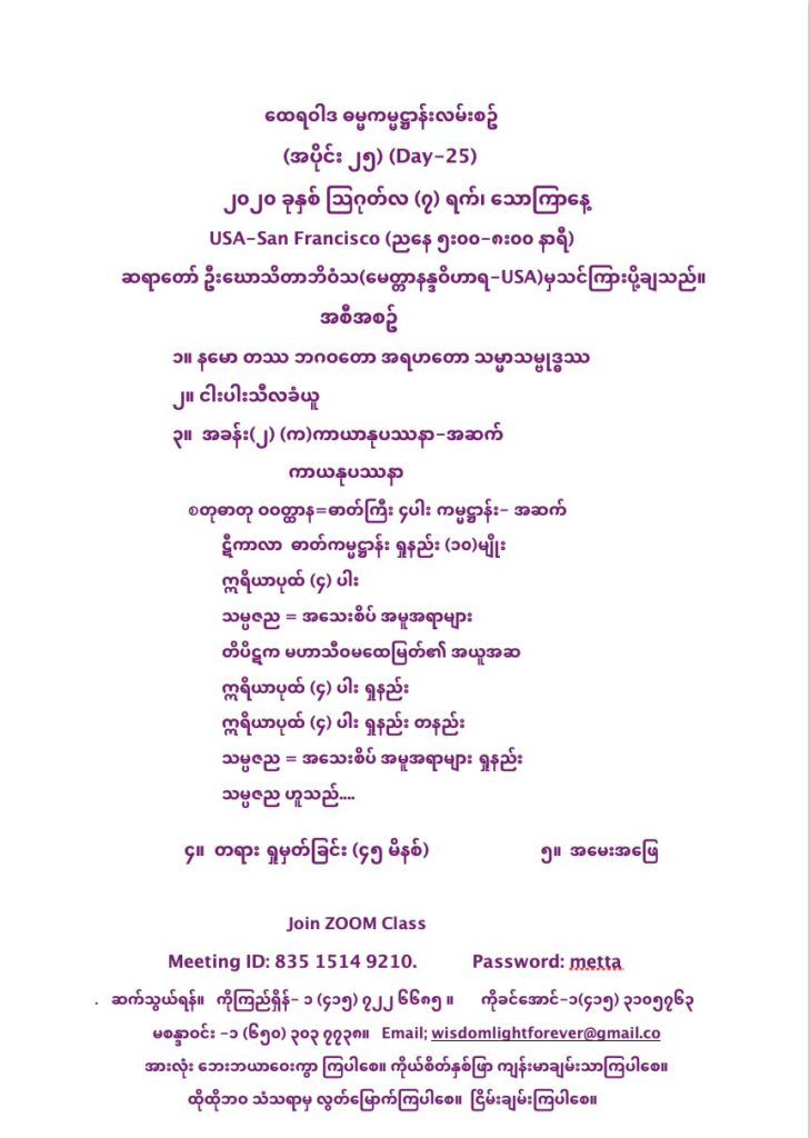 ထေရဝါဒ ဓမ္မကမ္မဌာန်း လမ်းစဥ် အပိုင်း(၂၅) August 7, 2020 / ညနေ သဘောတရားရေးရာအပိုင်း, ထေရဝါဒ ဓမ္မကမ္မဌာန်း လမ်းစဥ် အပိုင်း(၂၅) Day 25 နမော တဿ ဘဂဝတော အရဟတော သမ္မာသမ္ဗုဒ္ဓဿ (သုံးကြိမ်) သင်တန်း တရား ရှုမှတ်ခြင်း နှင့် တရားသိမ်းသင်တန်းမှတ်စုများ Downloads https://www.facebook.com/maungkyi.shein/videos/2673296706241649