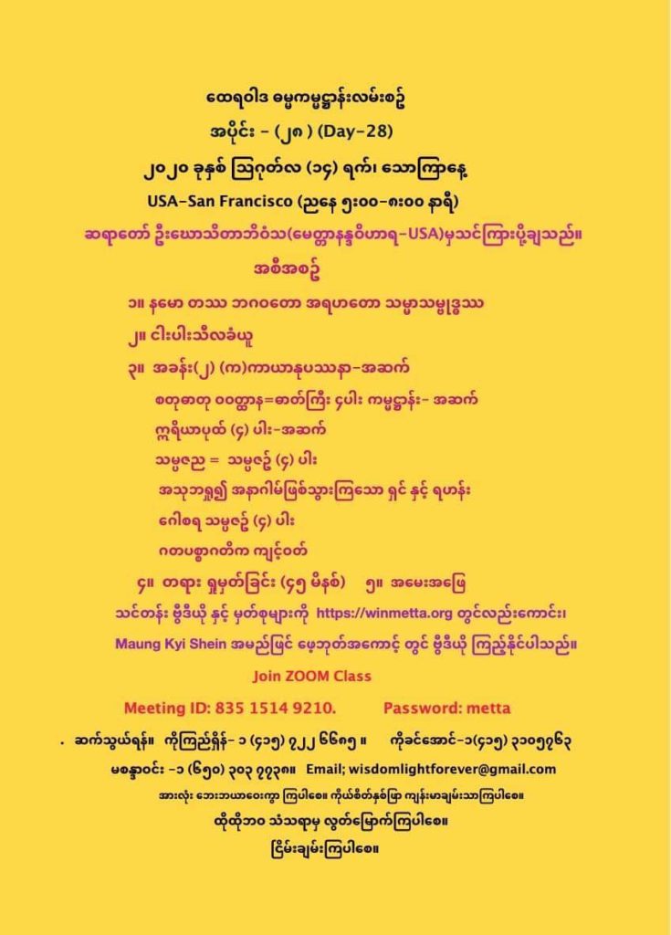 ထေရဝါဒ ဓမ္မကမ္မဌာန်း လမ်းစဥ် အပိုင်း(၂၈) August 14, 2020 / ညနေ သဘောတရားရေးရာအပိုင်း, ထေရဝါဒ ဓမ္မကမ္မဌာန်း လမ်းစဥ် အပိုင်း(၂၈) Day 28 https://www.facebook.com/maungkyi.shein/videos/2679480165623303 နမော တဿ ဘဂဝတော အရဟတော သမ္မာသမ္ဗုဒ္ဓဿ (သုံးကြိမ်) သင်တန်း တရား ရှုမှတ်ခြင်း နှင့် တရားသိမ်းသင်တန်းမှတ်စုများ Downloads