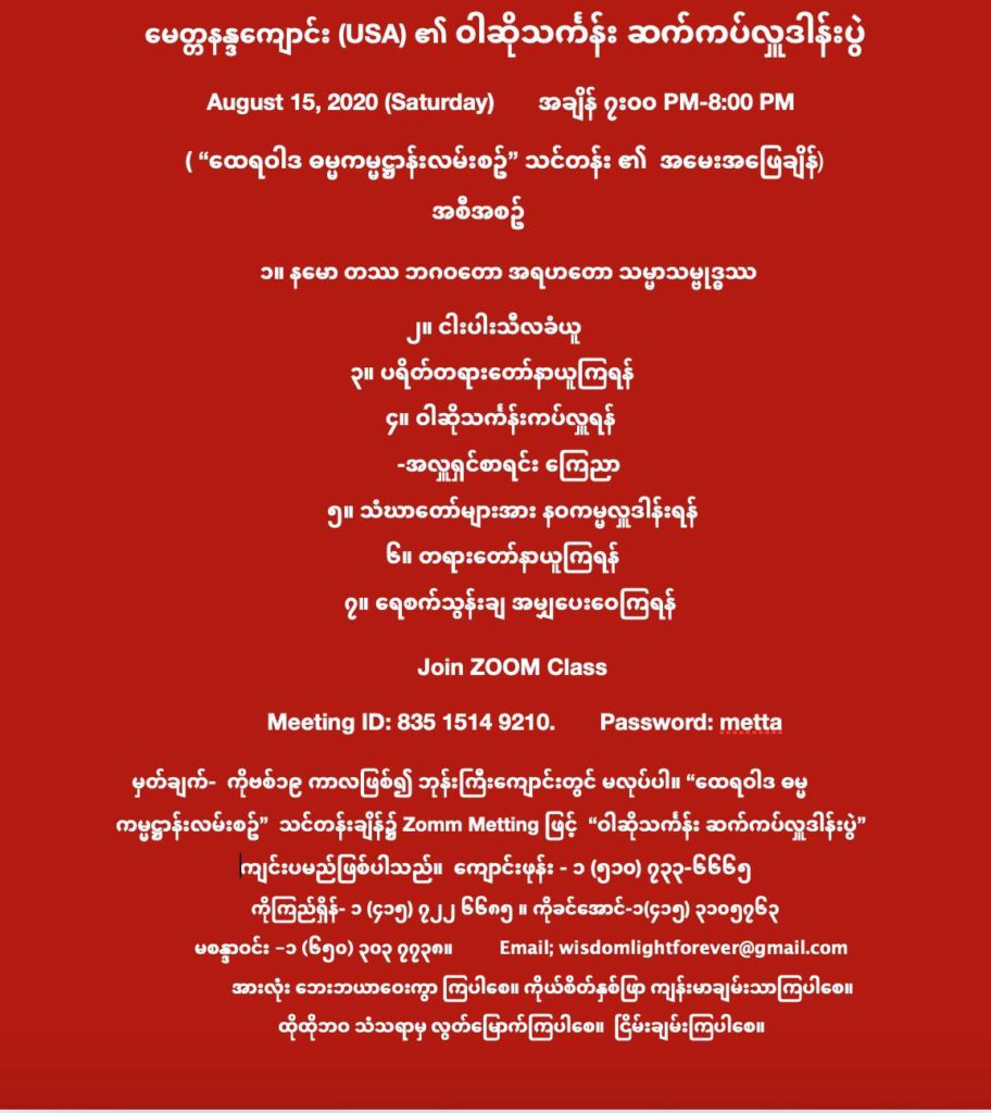 မေတ္တာနန္ဒဝိဟာရ (USA) ၏ ဝါဆိုသင်္ကန်း ဆက်ကပ်လှူဒါန်းပွဲ August 15, 2020 / News & Events, ဝါဆိုသင်္ကန်း ဆက်ကပ်လှူဒါန်းပွဲ https://www.facebook.com/maungkyi.shein/videos/2680483088856344 See donor list