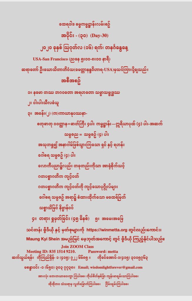 ထေရဝါဒ ဓမ္မကမ္မဌာန်း လမ်းစဥ် အပိုင်း(၃၀) August 16, 2020 / ညနေ သဘောတရားရေးရာအပိုင်း, ထေရဝါဒ ဓမ္မကမ္မဌာန်း လမ်းစဥ် အပိုင်း(၃၀) Day 30 နမော တဿ ဘဂဝတော အရဟတော သမ္မာသမ္ဗုဒ္ဓဿ (သုံးကြိမ်) သင်တန်း တရား ရှုမှတ်ခြင်း နှင့် တရားသိမ်းသင်တန်းမှတ်စုများ Downloads https://www.facebook.com/maungkyi.shein/videos/2682175078687145