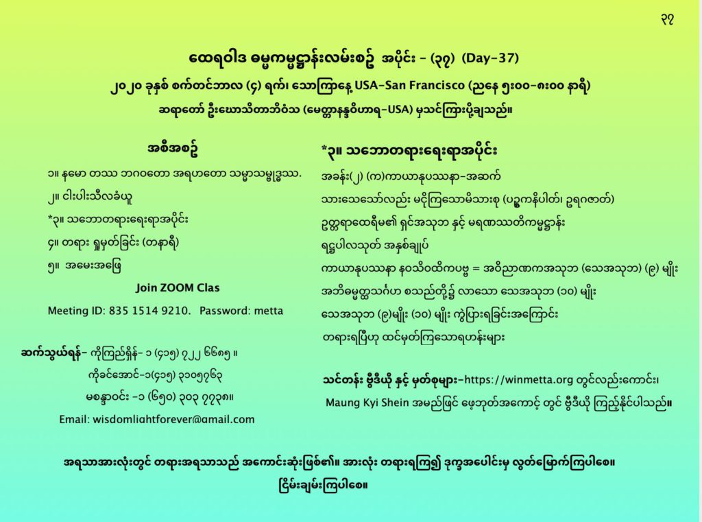 ထေရဝါဒ ဓမ္မကမ္မဌာန်း လမ်းစဥ် အပိုင်း(၃၇) September 4, 2020 / ညနေ သဘောတရားရေးရာအပိုင်း, ထေရဝါဒ ဓမ္မကမ္မဌာန်း လမ်းစဥ် အပိုင်း(၃၇) Day 37 နမော တဿ ဘဂဝတော အရဟတော သမ္မာသမ္ဗုဒ္ဓဿ (သုံးကြိမ်) သင်တန်း တရား ရှုမှတ်ခြင်း နှင့် တရားသိမ်းသင်တန်းမှတ်စုများ Downloads https://www.facebook.com/maungkyi.shein/videos/2698686283702691