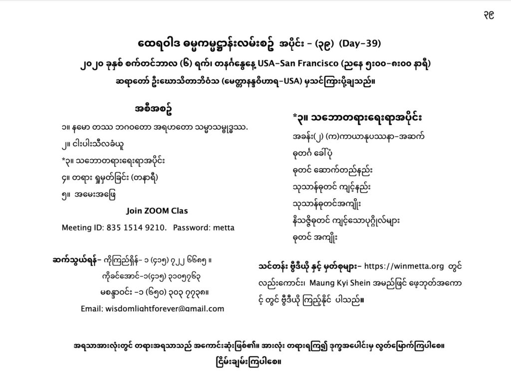 ထေရဝါဒ ဓမ္မကမ္မဌာန်း လမ်းစဥ် အပိုင်း(၃၉) September 6, 2020 / ညနေ သဘောတရားရေးရာအပိုင်း, ထေရဝါဒ ဓမ္မကမ္မဌာန်း လမ်းစဥ် အပိုင်း(x) Day x နမော တဿ ဘဂဝတော အရဟတော သမ္မာသမ္ဗုဒ္ဓဿ (သုံးကြိမ်) သင်တန်း တရား ရှုမှတ်ခြင်း နှင့် တရားသိမ်းသင်တန်းမှတ်စုများ Downloads https://www.facebook.com/maungkyi.shein/videos/2700757803495539