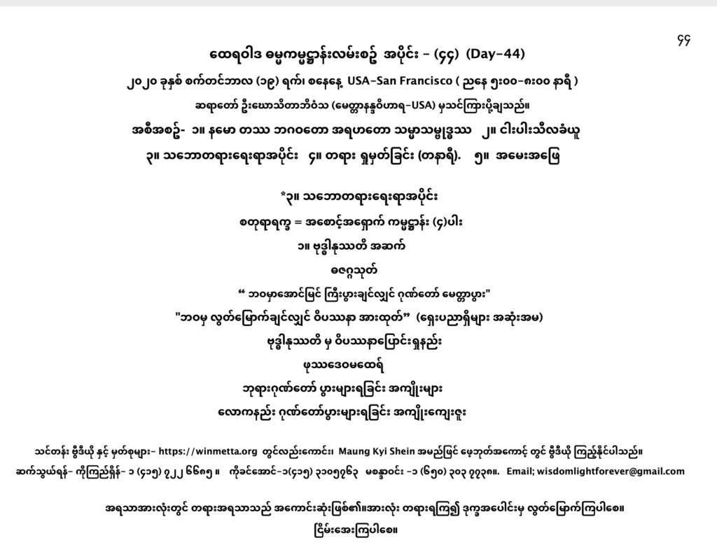 ထေရဝါဒ ဓမ္မကမ္မဌာန်း လမ်းစဥ် အပိုင်း(၄၄) September 19, 2020 / ညနေ သဘောတရားရေးရာအပိုင်း, ထေရဝါဒ ဓမ္မကမ္မဌာန်း လမ်းစဥ် အပိုင်း(၄၄) Day 44 နမော တဿ ဘဂဝတော အရဟတော သမ္မာသမ္ဗုဒ္ဓဿ (သုံးကြိမ်) သင်တန်း တရား ရှုမှတ်ခြင်း နှင့် တရားသိမ်းသင်တန်းမှတ်စုများ Downloads https://www.facebook.com/maungkyi.shein/videos/2712502552321064