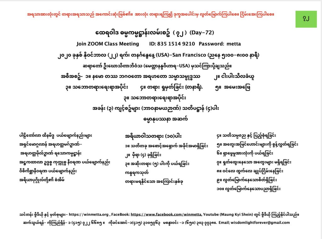 ထေရဝါဒ ဓမ္မကမ္မဌာန်း လမ်းစဥ် အပိုင်း(၇၂) November 22, 2020 / ညနေ သဘောတရားရေးရာအပိုင်း, ထေရဝါဒ ဓမ္မကမ္မဌာန်း လမ်းစဥ် အပိုင်း(၇၂) Day 72 နမော တဿ ဘဂဝတော အရဟတော သမ္မာသမ္ဗုဒ္ဓဿ (သုံးကြိမ်) သင်တန်း တရား ရှုမှတ်ခြင်း နှင့် တရားသိမ်းသင်တန်းမှတ်စုများ Downloads