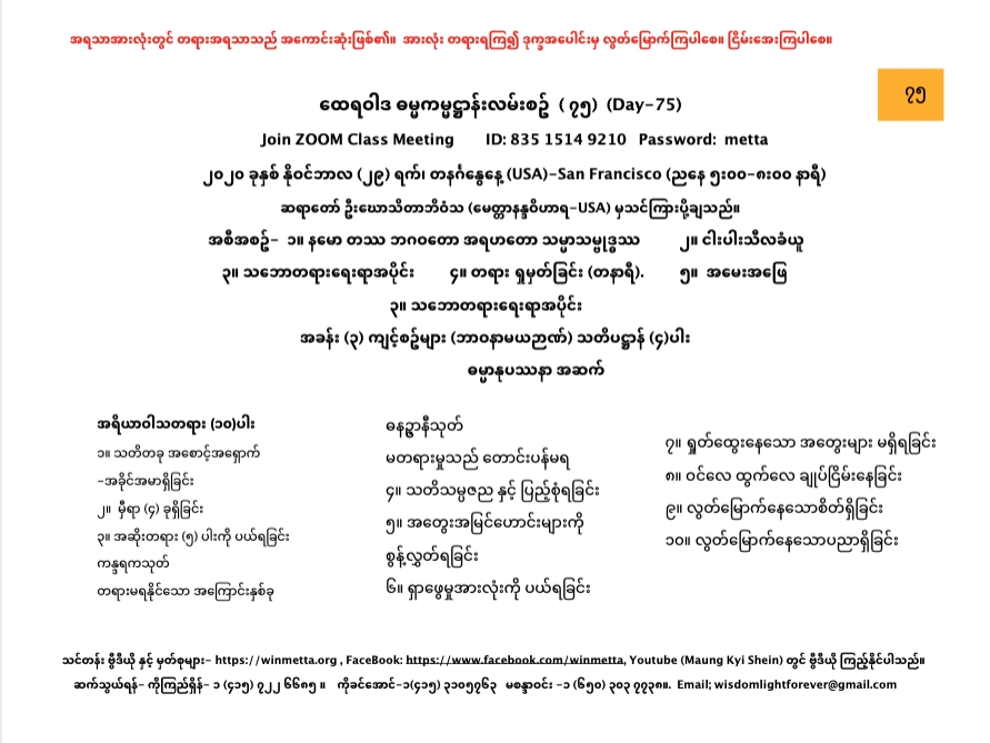 ထေရဝါဒ ဓမ္မကမ္မဌာန်း လမ်းစဥ် အပိုင်း(၇၅) November 29, 2020 / ညနေ သဘောတရားရေးရာအပိုင်း, ထေရဝါဒ ဓမ္မကမ္မဌာန်း လမ်းစဥ် အပိုင်း(၇၅) Day 75 နမော တဿ ဘဂဝတော အရဟတော သမ္မာသမ္ဗုဒ္ဓဿ (သုံးကြိမ်) သင်တန်း တရား ရှုမှတ်ခြင်း နှင့် တရားသိမ်းသင်တန်းမှတ်စုများ Downloads