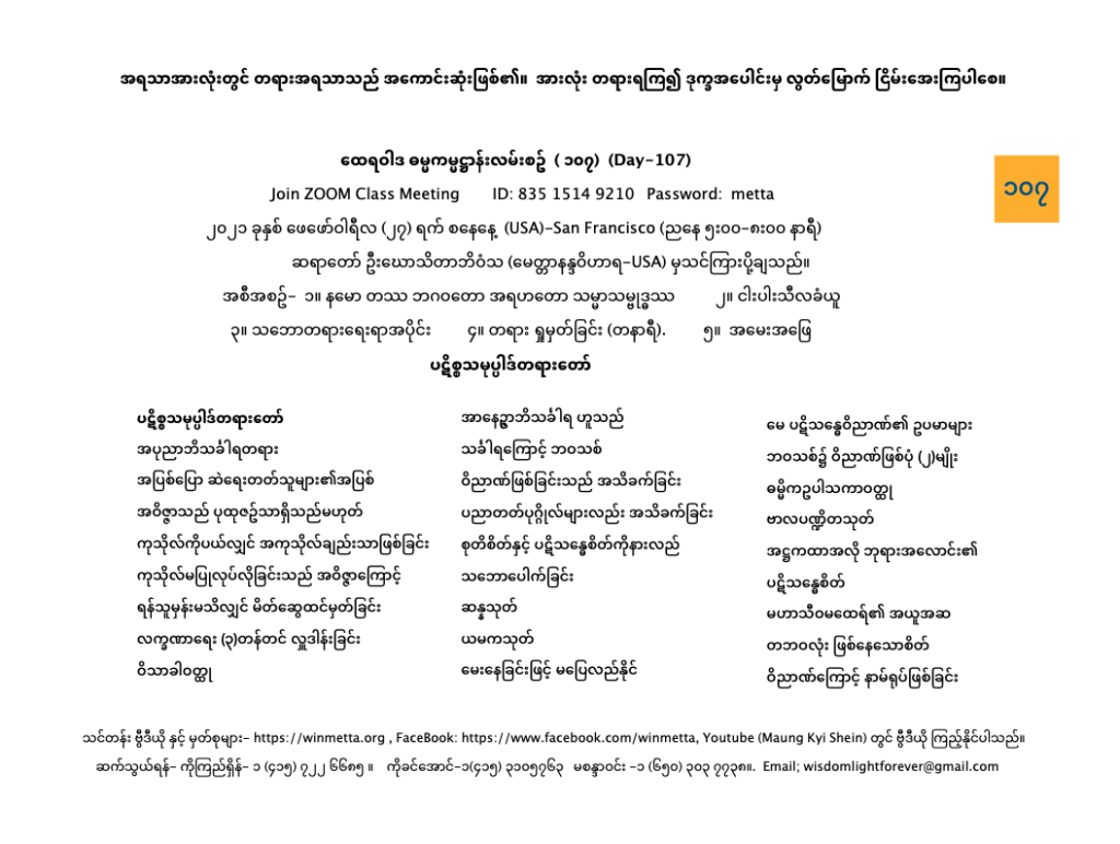 ထေရဝါဒ ဓမ္မကမ္မဌာန်း လမ်းစဥ် အပိုင်း(၁၀၇) February 27, 2021 / ညနေ သဘောတရားရေးရာအပိုင်း, ထေရဝါဒ ဓမ္မကမ္မဌာန်း လမ်းစဥ် အပိုင်း(၁၀၇) Day 107 နမော တဿ ဘဂဝတော အရဟတော သမ္မာသမ္ဗုဒ္ဓဿ (သုံးကြိမ်) သင်တန်း တရား ရှုမှတ်ခြင်း နှင့် တရားသိမ်းသင်တန်းမှတ်စုများ Downloads