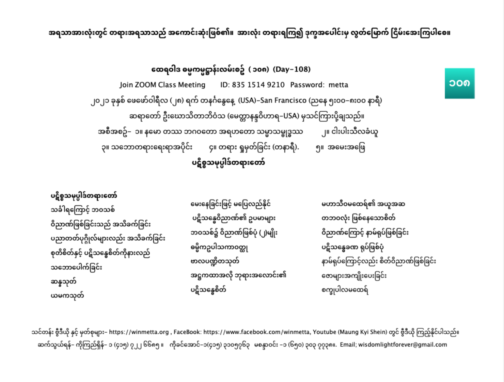 ထေရဝါဒ ဓမ္မကမ္မဌာန်း လမ်းစဥ် အပိုင်း(၁၀၈) February 28, 2021 / ညနေ သဘောတရားရေးရာအပိုင်း, ထေရဝါဒ ဓမ္မကမ္မဌာန်း လမ်းစဥ် အပိုင်း(၁၀8) Day 108 နမော တဿ ဘဂဝတော အရဟတော သမ္မာသမ္ဗုဒ္ဓဿ (သုံးကြိမ်) သင်တန်း တရား ရှုမှတ်ခြင်း နှင့် တရားသိမ်းသင်တန်းမှတ်စုများ Downloads