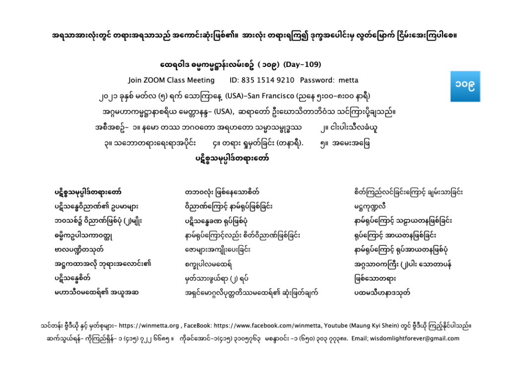 ထေရဝါဒ ဓမ္မကမ္မဌာန်း လမ်းစဥ် အပိုင်း(၁၀၉) March 5, 2021 / ညနေ သဘောတရားရေးရာအပိုင်း, ထေရဝါဒ ဓမ္မကမ္မဌာန်း လမ်းစဥ် အပိုင်း(၁၀၉) Day 109 နမော တဿ ဘဂဝတော အရဟတော သမ္မာသမ္ဗုဒ္ဓဿ (သုံးကြိမ်) သင်တန်း တရား ရှုမှတ်ခြင်း နှင့် တရားသိမ်းသင်တန်းမှတ်စုများ Downloads