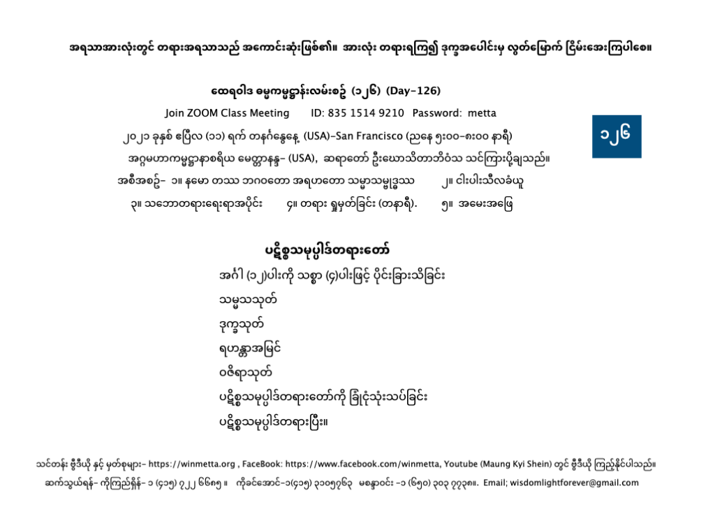 ထေရဝါဒ ဓမ္မကမ္မဌာန်း လမ်းစဥ် အပိုင်း(၁၂၆) April 11, 2021 / ညနေ သဘောတရားရေးရာအပိုင်း, ထေရဝါဒ ဓမ္မကမ္မဌာန်း လမ်းစဥ် အပိုင်း(၁၂၆) Day 126 နမော တဿ ဘဂဝတော အရဟတော သမ္မာသမ္ဗုဒ္ဓဿ (သုံးကြိမ်) သင်တန်း တရား ရှုမှတ်ခြင်း နှင့် တရားသိမ်းသင်တန်းမှတ်စုများ Downloads ထေရဝါဒ ဓမ္မကမ္မဋ္ဌာန်းလမ်းစဥ် (၁၂၆) ပဋိစ္စသမုပ္ပါဒ်တရားတော် အင်္ဂါ (၁၂)ပါးကို သစ္စာ (၄)ပါးဖြင့် ပိုင်းခြားသိခြင်းသမ္မသသုတ်ပဋိစ္စသမုပ္ပါဒ်တရားပြီး
