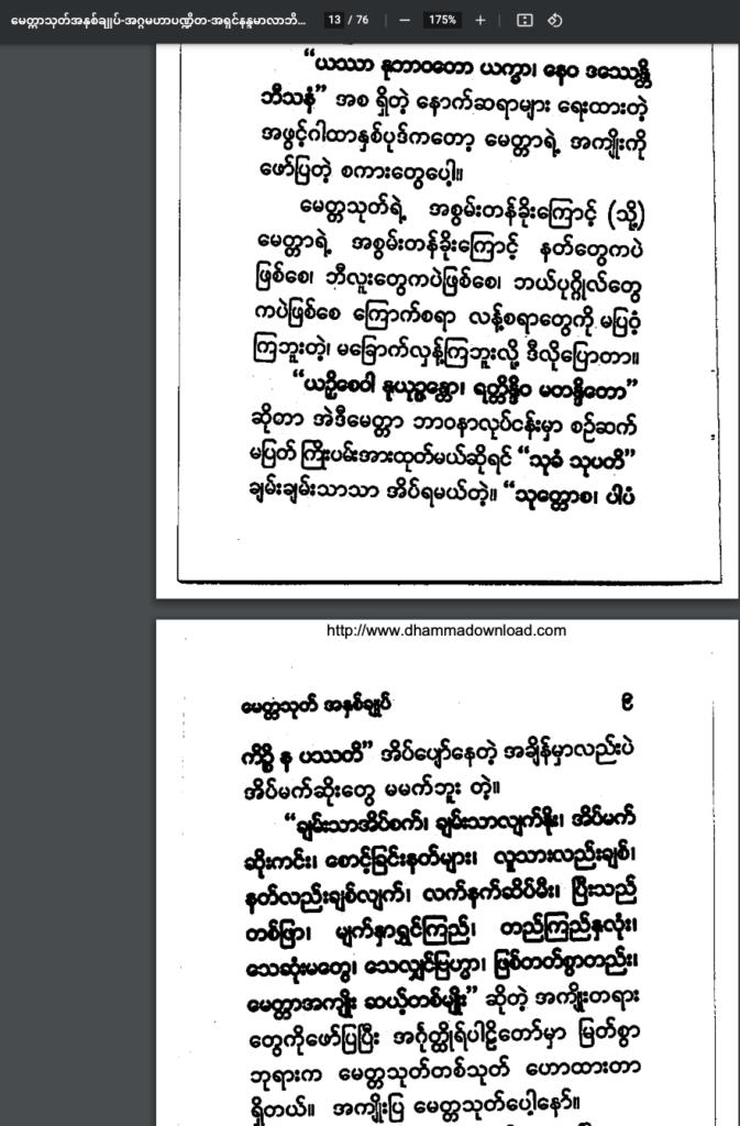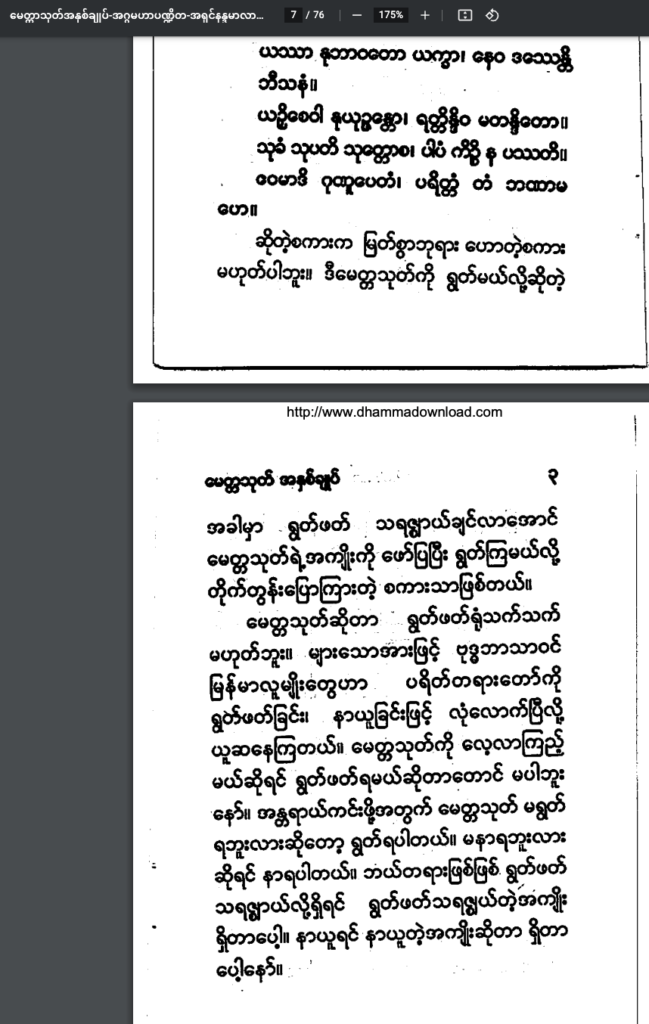 ၇။ မိခင်သည် ရှင်၌ ဖြစ်သော တဦးတည်းသားကို အသက်ရှင်စေရန် အစဉ်စောင့်ရှောက် ဘိသကဲ့သို့ ဤအတူပင် သတ္တဝါခပ်သိမ်းတို့၌ အတိုင်းအရှည်မရှိသော မေတ္တာစိတ်ကို ပွါးများရာ၏။