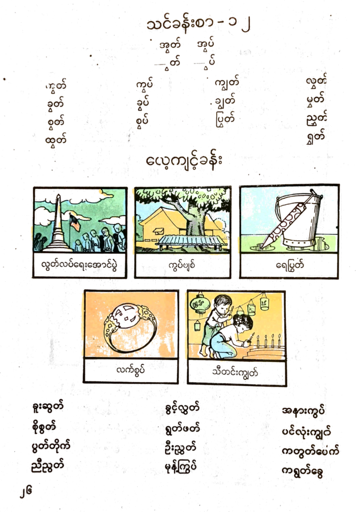 Let’s learn Burmese! Grade 2 – Lesson 12 – အွတ် အွပ် ွတ် ွပ် September 14, 2023 / Burmese Class Grade 2 Class Materials Burmese Grade 1 BookDownload Burmese Grade 2 BookDownload Burmese Practice – 2023-06-03 – 46 pagesDownload Let’s learn Burmese! Class Main Page ဦးဟုတ်စိန် မြန်မာ-အင်္ဂလိပ်-ပါဠိ အဘိဓာန် Myanmar-English-Pali (MEP) Dictionary by U Hote Sein Microsoft Windows App (for Windows PC, laptop) iOS, macOS App (for iPhone, iPad, MacBook) Android App (for Android Phone, Tablet)
